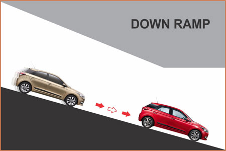 When the vehicle is moving Downwards in a descending way / down gradient, The driver cannot take out his/her legs from the brake pedal If so, the vehicle will roll front due to the gravity.